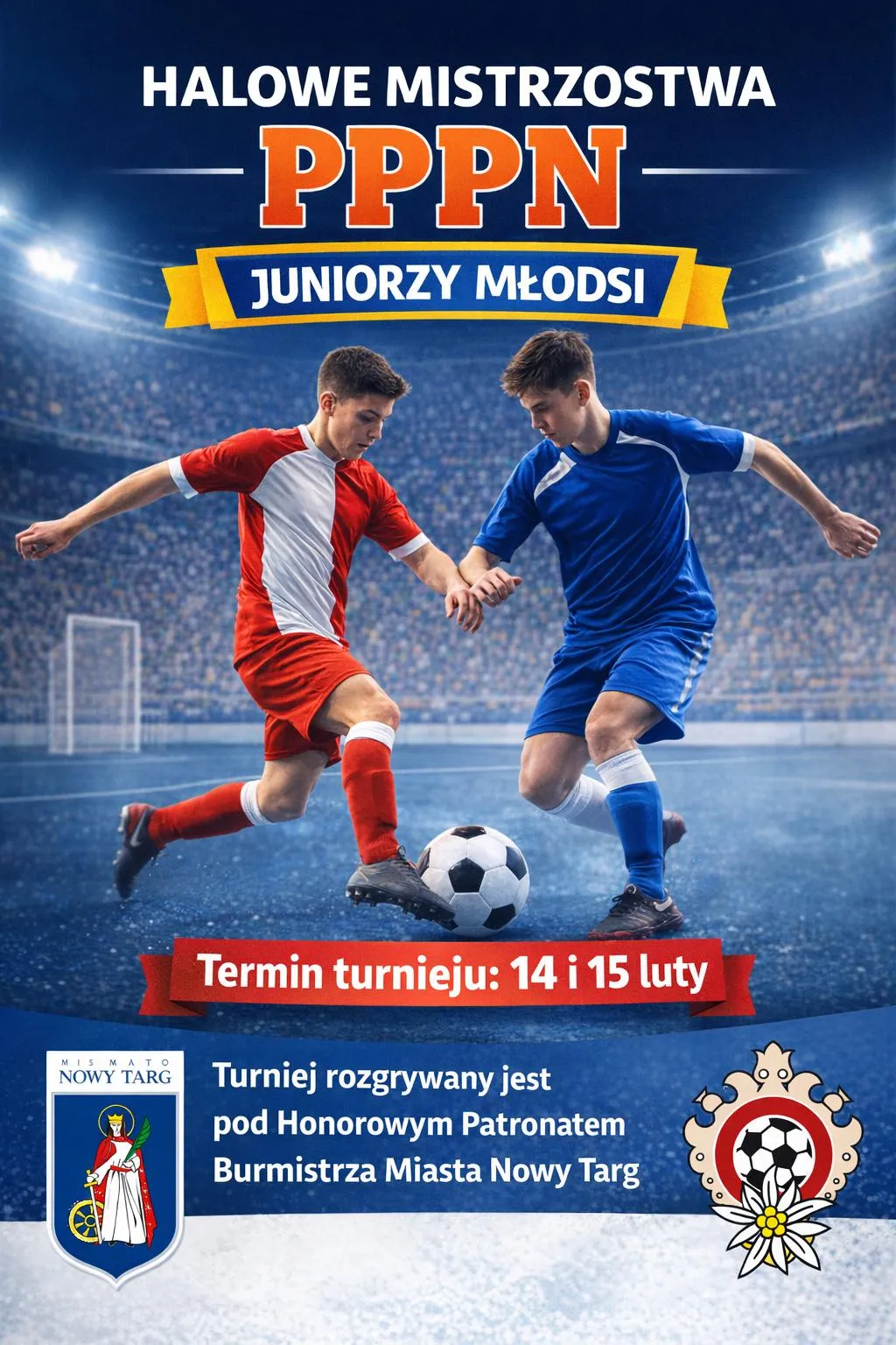 Halowe Mistrzostwa PPPN – Juniorzy Młodsi odbędą się w dniach 14–15 lutego w hali „Metalka” przy Zespole Szkół Technicznych w Nowym Targu. W turnieju weźmie udział 12 zgłoszonych drużyn, a zawody rozgrywane będą pod Honorowym Patronatem Burmistrza Miasta Nowy Targ. Celem turnieju jest sportowa rywalizacja oraz podsumowanie halowego etapu rozgrywek młodzieżowych.