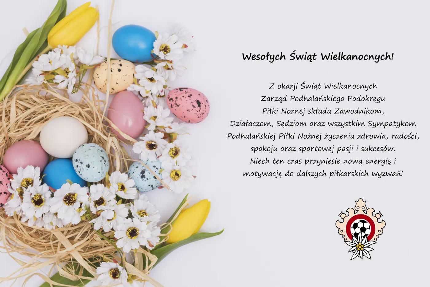 Z okazji Świąt Wielkanocnych Zarząd Podhalańskiego Podokręgu Piłki Nożnej składa Zawodnikom, Działaczom, Sędziom oraz wszystkim Sympatykom Podhalańskiej Piłki Nożnej życzenia zdrowia, radości, spokoju oraz sportowej pasji i sukcesów. Niech ten czas przyniesie nową energię i motywację do dalszych piłkarskich wyzwań !