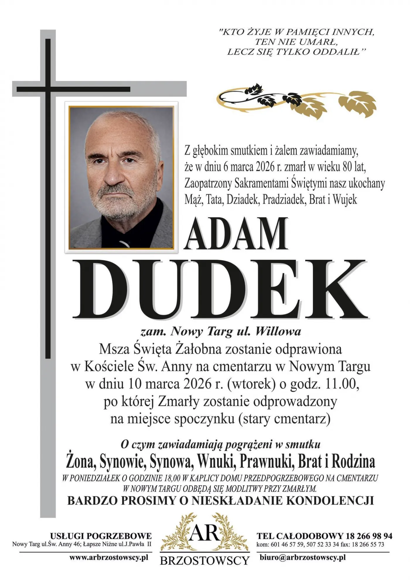 Uroczystości pogrzebowe odbędą się 10 marca 2026 r. (wtorek) o godz. 11:00 w Kościele św. Anny na cmentarzu w Nowym Targu. Po Mszy Świętej Zmarły zostanie odprowadzony na miejsce wiecznego spoczynku.